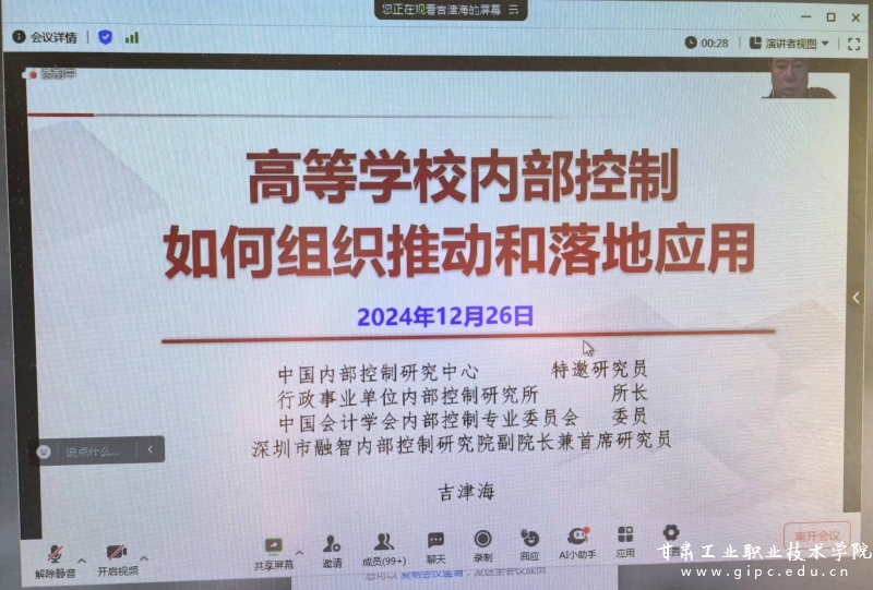 会上,中国内部控制研究中心特邀研究员、行政事业单位内部控制研究所所长、中国会计学会内部控制专业委员会委员、深圳市融智内部控制研究院副院长兼首席研究员吉津海做了关于《高等学校内部控制——如何组织推动和落地应用》的专题讲座。吉津海基于政策文件,深入浅出地剖析了内部控制工作在高校各业务部门/环节的重要意义,并全面系统地讲解了高等学校如何组织并推动学校内部控制工作落地应用。