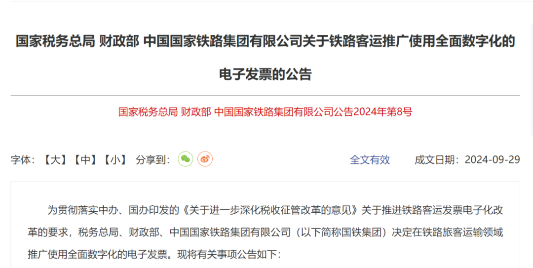 为了紧跟国家政策,规范本校发票报销,并根据《国家税务总局 财政部 中国国家铁路集团有限公司关于铁路客运推广使用全面数字化的电子发票的公告》(2024年第8号)的要求,财务处决定自2024年11月1日起启用火车电子发票的报销工作。